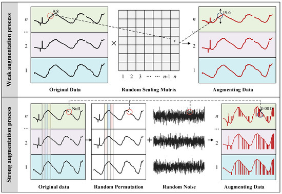 In this context, both weak and strong data augmentation methods are applied. For a given time series , weak augmentation involves scaling the input time series data by multiplying each channel by a random factor drawn from a normal distribution, introducing scale variations.