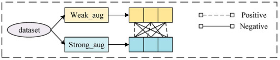 Temporal information alone is insufficient for analyzing spatially correlated time series data, such as those found in dam deformation. The spatial contrast module, when added to the temporal–spatial contrastive learning pretraining (TSCLP) framework, enables the extraction of spatiotemporal features. Utilizing contrastive loss alongside nonlinear transformations, this module extracts spatial features by transforming predictions from the temporal contrast module through nonlinear projection heads, which facilitate spatial comparisons. These projection heads consist of two linear layers, including a batch normalization layer and a nonlinear activation function, allowing for the encapsulation of spatial details across multiple original data samples. Each set of samples, modified through weak and strong augmentations and transformations, yields two sets of spatial features. Spatial features generated from two augmented views of the same input are considered a pair of positive samples, while those from different inputs within the same batch are treated as a pair of negative samples, as illustrated in Figure 4. The spatial contrastive loss function aims to maximize the similarity between pairs of positive samples and minimize the similarity between pairs of negative samples, thereby ensuring the final representation captures spatial correlations.