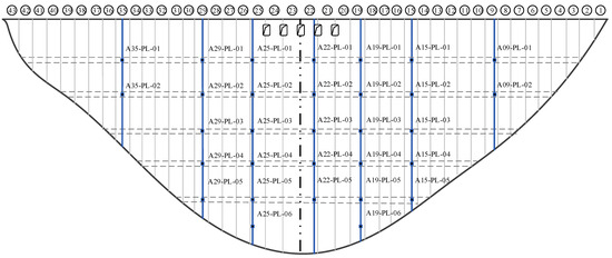 The case study focuses on a concrete arch dam in Yunnan Province, China. Figure 5 presents photographs of the dam from upstream and downstream perspectives. Horizontal deformation, a critical monitoring aspect, is tracked by a pendulum system installed within the dam structure. Figure 6 illustrates the comprehensive arrangement of the dam’s pendulum system. In seven dam sections (9#, 15#, 19#, 22#, 25#, 29#, and 35#) across various gallery levels (at elevations of 1014 m, 1054 m, 1100 m, 1150 m, and 1190 m), vertical pendulums are strategically placed in segments within the foundation gallery, grouting gallery, and at the inverted pendulum connections to monitor the dam’s horizontal deformation and deflection. The pendulums primarily employ automated monitoring with the use of capacitive pendulum inclinometers, recording observations three times a day. For additional accuracy, manual observations using optical pendulum inclinometers are conducted monthly.