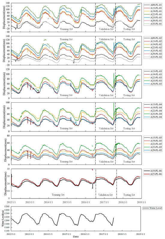Figure 7 presents the long-term monitoring series of horizontal deformations at various measuring points, with the sample series spanning from 1 January 2012, to 3 December 2018, at a daily data sampling frequency. An analysis reveals that changes in upstream water levels predominantly influence the dam’s horizontal deformation, resulting in downstream deformation as water levels increase and an upstream rebound when they decrease. Moreover, deformation trends and periodic changes at different locations exhibit remarkable similarity, and nearly all measuring points show anomalies around 1 January 2013, indicating spatial correlation among the deformations. The collected data contain missing values and outliers and involve numerous measuring points, making label creation time-consuming and labor-intensive, thereby rendering supervised learning impractical.
