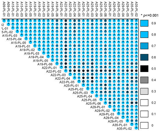 A Pearson correlation analysis was performed on the deformation data from each measuring point, with the results displayed in Figure 8. The color gradient from white to blue indicates the absolute value of the correlation coefficient, ra nging from 0 to 1, where asterisks denote significance levels. The analysis reveals that all measuring points are correlated, with correlation coefficients above 0.5 and significance values (p) less than 0.001, suggesting that the correlations between measuring points are statistically significant. In this study, a threshold (S) of 0.6 was selected; points with correlations above this threshold were considered to have significant relationships. The original data were then multiplied by the corresponding correlation matrix to generate a sequence with spatial features. This sequence underwent initialization and sliding window operations to create a dataset with spatiotemporal features, which was divided into training, testing, and validation sets in a 4:1:1 ratio.