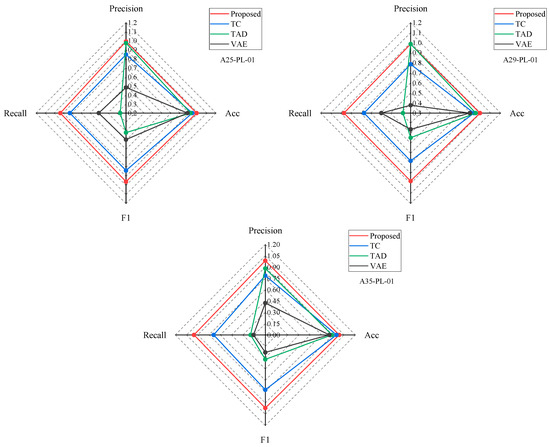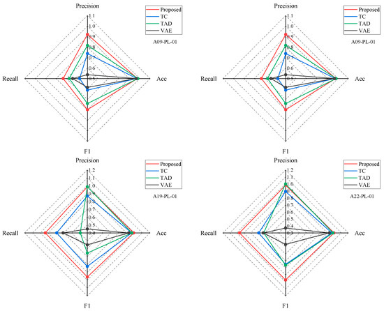 Figure 11 displays the comparative results of anomaly detection across various methods for representative measuring points. The four axes represent precision, recall, accuracy, and F1 score metrics, with identical value ranges and scale sizes across axes. A metric value closer to one indicates better detection performance. The shaded areas in different colors illustrate the performance of each method on these metrics, as follows: red for the proposed method, blue for TC, green for TAD, and black for GAN-VAE. The size of the shaded area visually represents the method’s overall effectiveness, with larger areas indicating superior anomaly detection capabilities.