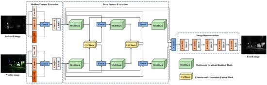 (1) An end-to-end IVIF model is provided, primarily composed of a shallow multi-scale feature extraction module, a multi-scale gradient residual block (MGRB), and a cross-transfer attention fusion block (CAFB). Dense connections are also incorporated to alleviate the information loss caused by the feature flow.