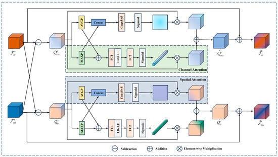 The weighted refined complementary features are acquired using CA and SA, respectively. For , average pooling (AVGP) and max pooling (MAXP) operations are first performed on the spatial locations, and then the resulting features are concatenated along the channel dimension. The spatial weight map is generated after dimensionality reduction using 5 × 5 convolution operation and activation via the Sigmoid function. Lastly, the refined complementary feature with spatial location weights is derived by multiplying it with the input feature . The computational process is represented as