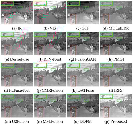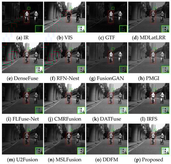 Several image pairs are selected in the MSRS dataset to visually compare the fused results yielded by different approaches, as presented in Figure 6, Figure 7 and Figure 8. The scenarios cover both daytime and nighttime conditions, and each scene image contains human significant targets and detailed regions. For clear comparisons, the salient and detailed regions are highlighted with red and green boxes, respectively, and the boxed regions are amplified in the corners of the images as needed.