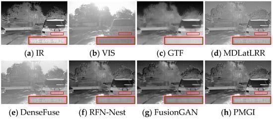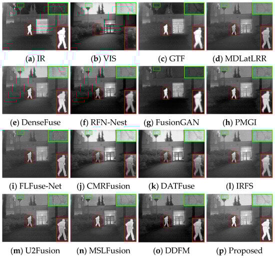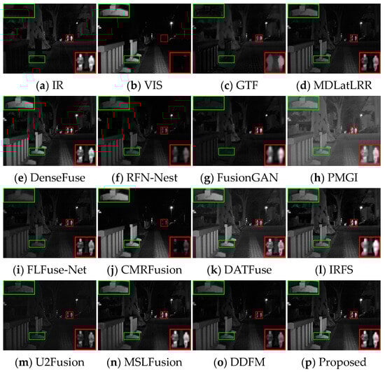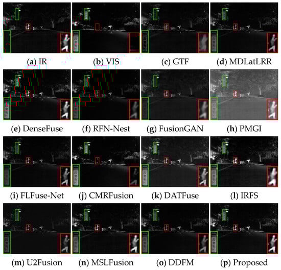 In the night scene, it is inaccurate to define IVIF narrowly as the preservation of background texture from visible images and salient targets from infrared images. This is because the imaging quality of the optical device is relatively inferior, while the infrared image contains the primary prominent target information, as well as the important background details. Therefore, the significant targets and the detailed texture in both images need to be considered simultaneously in this instance. As can be seen from Figure 7, GTF, RFN-Nest, and FusionGAN lose both salient targets (red box) and background texture information (green box), resulting in a devastating fusion effect. The images produced by MDLatLRR, FLFuse-Net, U2Fusion, and DDFM are similar to the weakened infrared images, exhibiting inconspicuous infrared targets and dark background information. CMRFusion’s result has a faint infrared target, while the IRFS image presents a distinct target but quite blurred edge contours. PMGI injects noise into the fused image, leading to poor image contrast. Figure 8 also exhibits similar fusion results. Only DenseFuse, DATFuse, MSLFusion, and the proposed method yield better fusion results with well-preserved infrared targets. However, MEEAFusion has the sharpest detailed texture, which can be attributed to the CAFB modules that fully preserve the complementary features in the visible and infrared images and consequently mitigate the interference of the illumination factors.