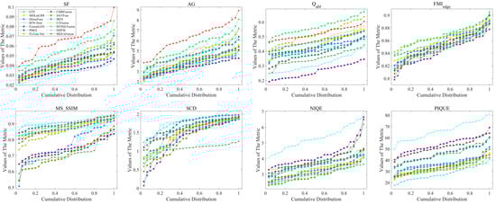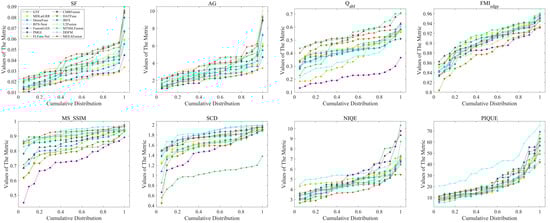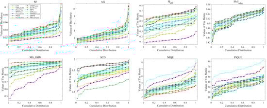 Data distribution of fusion results for 30 pairs of RoadScene images over the eight objective evaluation criteria. Each point (x, y) in this Figure means (100 × x)% of fused images whose metric values do not exceed y.