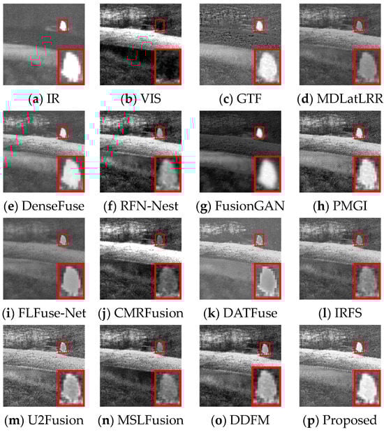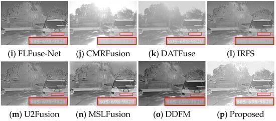 Figure 6 illustrates that fused images of various algorithms present obvious differences in the daytime scene. GTF, FusionGAN, and IRFS have significant human targets (red boxes) but blurred details (green boxes). Among them, the GTF result is close to infrared images in terms of contrast with a severe loss of detail texture, the FusionGAN images have poorly defined edge contours, and the IRFS result is dark overall. The detail texture in MDLatLRR, DATFuse, and U2Fusion is relatively clear, but the infrared target is relatively weak. CMRFusion’s result exhibits a strong resemblance to the visible image, leading to a significant loss of infrared information. U2Fusion also lacks infrared features, appearing as image distortion. RFN-Nest, PMGI, FLFuse-Net, and DDFM have weak salient targets, and the image details appear less clear; the FLFuse-Net image especially encounters difficulty in distinguishing the leaves in the background. MSLFusion introduces spectral contamination and artifacts in the fused images. Only DenseFuse and the proposed method MEEAFusion could preserve infrared targets and background details better, and the fused image yielded by MEEAFusion has more salient targets and clearer edge contours thanks to the designed shallow multi-scale module, MGRB module, and CAFB module.