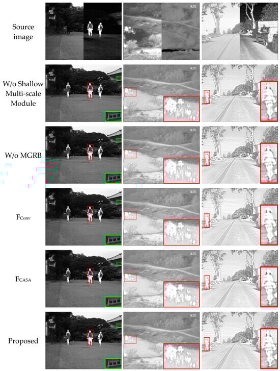 A quantitative comparison of the average rankings results of the ablation experiments is given in Table 5. It can be seen that the proposed algorithm achieves the best ranking on all three datasets. The worst results of the fusion algorithm on the MSRS and RoadScene datasets occurred when losing the MGRB module, which illustrates that the MGRB module dramatically improved the quality of the fused images in complex scenes. The numerical results on the TNO dataset remained unchanged, which is probably due to the simplicity of the image scenes. Without the CAFB module, the ranking metrics all undergo a drop; in particular, the FConv fusion results are noticeably worse than those of FCASA, which also further verifies the significance of the attention mechanism in image fusion.