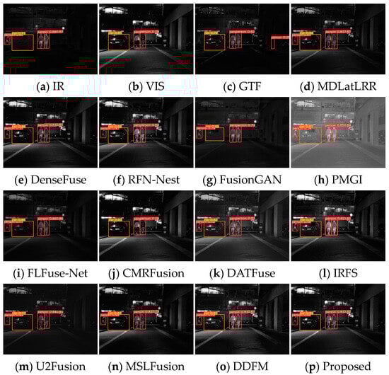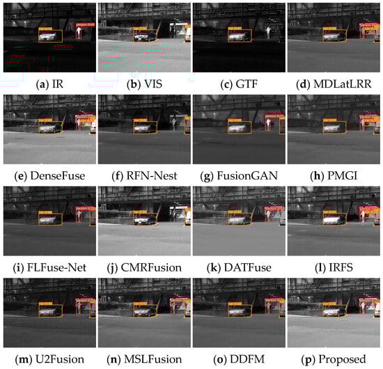 As illustrated in Figure 17, in the daytime scene, the detection result of the infrared image misses the vehicle. The human target in the visible light image is in the shadows and difficult to distinguish and also appears to be missed. The GTF image is close to the infrared image, but the details are more blurred, resulting in missed detection of both human and vehicle targets. The detection results of RFN-Nest, CMRFusion, and DATFuse lose either the person or car. Moreover, MDLatLRR, DenseFuse, PMGI, and IRFS show false detections. FusionGAN, FLFuse-Net, U2Fusion, MSLFusion, DDFM, and MEEAFusion correctly discover all persons and cars. In the night scenario, the infrared image results successfully detect all targets, and the visible image results miss the leftmost human target in the dark, as shown in Figure 18. Apart from GTF and CMRFusion, all other fusion algorithms could detect all objects correctly, verifying the facilitating function of image fusion processing for target detection.