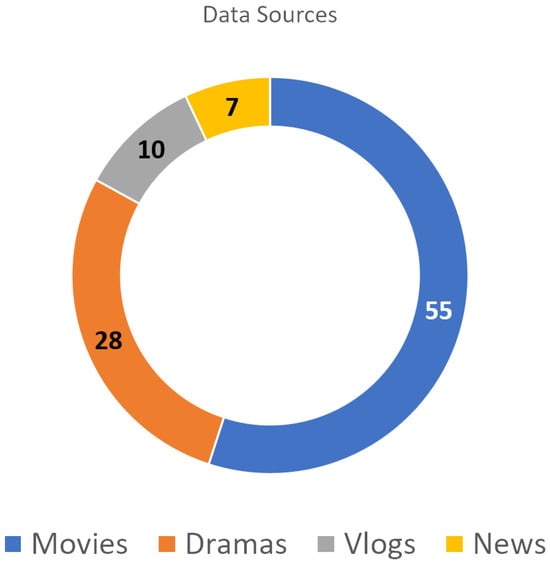 This work manually collected YouTube videos from multiple domains, such as movies, dramas, and video blogs (vlogs). This was performed to ensure that our dataset included many emotions and scenarios. Figure 1 shows a detailed breakdown of the domains represented in the dataset.
