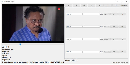 We developed a data annotation tool in Python 3.10.9 using the PyQT framework. Figure 2 shows a snapshot of the tool. The main features of this tool are video loading, frame range selection, annotation, and saving. It also shows a total number of files collected in each class. In addition, forwarding/rewinding by 2/5 s is also provided for catching a particular moment. The annotation tool is available at https://github.com/avishek-018/AVaTER (accessed on 20 February 2024).