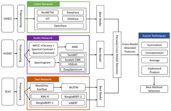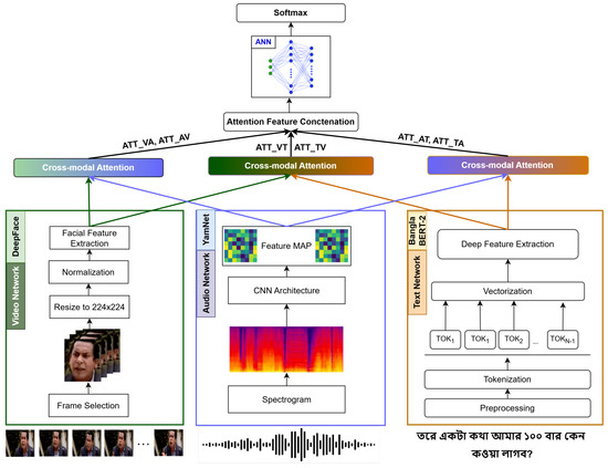 Cross-modal attention allows the model to focus on the most relevant parts of each modality concerning the other, enhancing the understanding of the combined information. This mechanism has been used in some non-emotion corpuses. For instance, ref. [44] introduces the AVCRFormer model. This novel transformer-based architecture integrates audio and visual features using a spatio-temporal cross-attention fusion strategy for audio–visual speech recognition. This work focuses on a non-emotion corpus, where the cross-attention mechanism is specifically utilized to effectively align and fuse the audio and visual modalities, enhancing the model’s ability to recognize speech in challenging environments. In our case of multimodal emotion corpus, the best models from the video, audio, and text networks are chosen based on their weighted F1-score and prepared for cross-attention between each modality pair. The performance is measured based on the F1-score. Upon extracting features from the three modalities (audio, video, and text), the features of each modality undergo normalization to ensure uniform importance across all features. Following this, a cross-modal attention mechanism is implemented across three modality pairs: audio–video, audio–text, and video–text. In the case of the audio–video pair, this mechanism aids in synchronizing lip movements with speech, enhancing the recognition of spoken emotions. For the audio–text pair, integrating the tone of voice with textual content offers a more nuanced understanding of the sentiment conveyed in the speech. Furthermore, the video–text pair leverages facial expressions and body language to provide additional context to the spoken words, thereby facilitating the disambiguation of textual emotions.