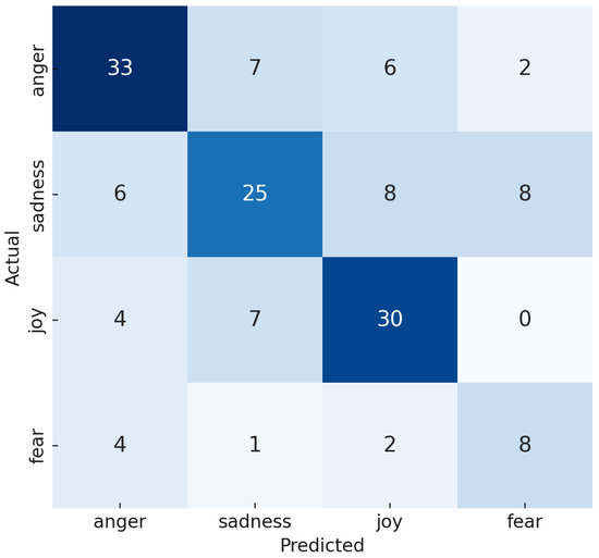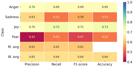 Figure 5 illustrates the class-wise performance metrics of the proposed multimodal approach. The joy class achieved the highest F1-score of 0.71 and recall of 0.73, demonstrating a solid capability to recognize joyful expressions. The anger class exhibited the highest precision at 0.70, with a balanced performance and an F1-score of 0.69. Although the fear class had a precision of 0.42, it showed a recall of 0.53, indicating that while it missed some instances, it accurately identified fear in many cases. Conversely, the sadness class had relatively lower performance, with an F1-score of 0.58, underscoring the challenges in accurately detecting sadness.