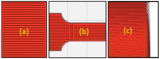 Table 2 shows four significant printing parameters (printing orientation, nozzle size, infill density, and layer thickness) that were taken into account in this research at various beam geometrical dimensions, because prior research proposed that these parameters had the most significant effect on structural damping behaviour [35]. Various beam thicknesses were used, and the 3D printing parameters were adjusted to create components with varying damping structures. These parameters also impacted the FDM process’s other dimensions, including the manufacturing duration and expenses entailed. According to [52], a printing orientation of 0° had the most significant impact on damping behaviour. The infill density has the most significant influence on damping behaviour [35]. Furthermore, the nozzle size of mm fit in terms of printing time and increased the damping in specimens. The layer thickness was determined using default configurations. These settings represented the standard setting range of the chosen 3D printer and produced outstanding printing quality. Figure 2 depicts the chosen values given for each parameter in Table 2.