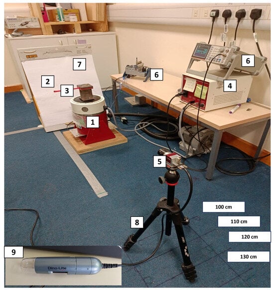 Experimental setup and procedures. 1 Shaker 2 Accelerometer 3 Specimen 4 Power Amplifier 5 Camera 6 Function Generator 7 White Background 8 Tripod 9 Microscopy Camera.