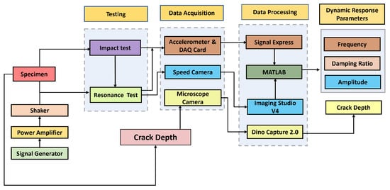 Figure 4 presents a systematic flow diagram of the experimental procedures. These procedures were designed to collect data on dynamic response parameters, employing a diverse range of data collection methods. The flow diagram was divided into types of testing used to collect the data using different acquisition systems, such as cameras and an accelerometer, as well as data processing software to analyse the data obtained and other devices used to perform the testing.