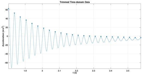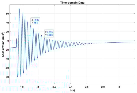 Impact testing is a fundamental technique within an experimental approach analysis. It enables the determination of a structure’s natural vibration frequencies. This project used the impact test to evaluate the behaviour of the ABS cantilever beam. In this test, a sudden force was applied to the free end of the ABS beam by striking it with a finger or a small tool. The accelerometer was fixed to the same free end to record the acceleration over time at a sampling rate of 25,600 Hz. The recorded data were imported into the MATLAB application and plotted in the time domain to measure the fundamental frequency and damping ratio. The fundamental frequency determines the difference in indices and corresponding time values of the two peaks, as shown in Figure 5 the time (t) values in the x axis for 1.905 s and 2.073 s.