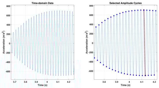 Y.B.Yang et al. [65] provided a study that recently investigated the importance of beam resonance for a better understanding and examined resonance and cancellation conditions in beams with moving loads. Resonance testing is a method that uses the natural vibration frequencies of a structure or a system to measure resonance amplitude. Impact tests measured the fundamental frequency of the intact and cracked beam. Then, the beam was excited under the resonance vibration to measure the maximum amplitude. The maximum amplitudes were determined by measuring acceleration values and time intervals at peak and trough points. The top point in the red line is the peak point, while the bottom is the trough point, as shown in Figure 7. Both an accelerometer and a camera were used during the resonance to collect the data for further analysis to measure the resonance amplitude.
