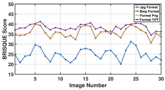 Incorporating the No-Reference Image Quality Assessment () through the The Blind/References Image Spatial Quality Evaluator (BRISQUE) methodology is integral to our approach to determining the optimal image format. Figure 8 shows the result of 30 scores listed across different image formats: JPG, BMP, PNG, and TIFF. These scores measure image quality, with lower scores indicating better quality. measures the number of artefacts and distortions in an image, so a lower score suggests fewer artefacts and distortions and, therefore, better quality. Generally, JPG images have lower scores, recommending better image quality for most images. BMP images have relatively higher scores than JPG, and BMP is a lossless format but can result in larger file sizes. PNG scores vary but are mostly lower than BMP and higher than JPG, and PNG is a lossless format that supports transparency and is often used for images with sharp edges, text, or areas of uniform colour. If the goal is to minimise artefacts and distortions, especially in images with smooth colour transitions, JPG is the best-performing format in this specific set of images. However, choosing the ‘best’ format depends on the images’ particular characteristics and the application’s requirements. Ultimately, the choice of image format depends on the user’s specific requirements, such as whether the user desires a smaller file size, lossless compression, or other factors.