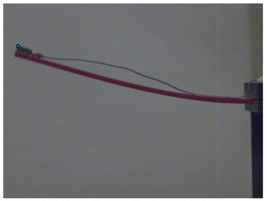 The fundamental frequency and resonance amplitude were extracted from the camera data using the following method: first, the resonance testing was recorded using a speed camera to capture the movement of the beam with different camera settings, as proposed. The next step involved analysing the data to measure the dynamic response of the structure’s (beam) vibration. This was done by applying appropriate image processing techniques to detect the tips of the vibrating beam, as illustrated in Figure 9. The fundamental frequency and resonance amplitude were carefully extracted from the camera data using the following method: first, the resonance testing was recorded with the utmost precision using a speed camera to capture the movement of the beam with different camera settings, as proposed. The next step involved thoroughly analysing the data to measure the dynamic response of the structure’s (beam) vibration. This was done by applying appropriate image processing techniques to detect the tips of the vibrating beam.