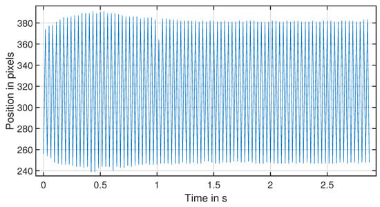 One way to perform time domain analysis is to use a camera to track the beam tip position over time in each frame. The sampling rate of this process depends on the frame rate of the video recording and the number of samples per frame. A time vector can be created by dividing the number of frames by the sampling rate and the number of samples per frame. If the test video duration is 2 s and the video is recorded at 50 frames per second, the time vector can be calculated in a logical sequence. First, the time interval was determined as . Then, the number of images was calculated as . Therefore, a time vector that spans from 0 to 1.98 s in increments of 0.02 s was determined to be needed to record 100 images in 2 s. The time vector = [0.0, 0.02, 0.04, 0.06, 0.08, 0.1,…, 1.98]. The y position of the beam’s tip can be plotted against the time vector to show the beam tip’s motion over time. The time domain of the vibration beam structure is shown in Figure 12.