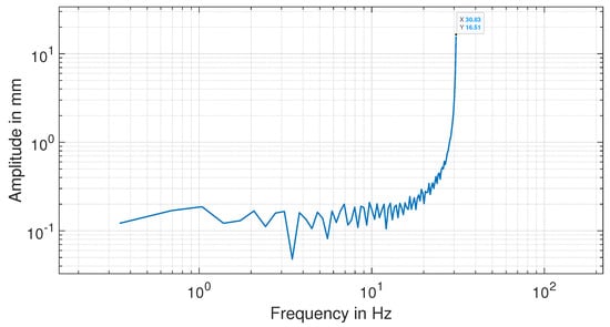 Figure 13 shows the result of using FFT to convert the beam vibration image-based time domain to the frequency domain. This technique transformed the time domain data into the frequency domain, where dynamic response parameters measure the resonance amplitude and the fundamental frequency. The beam’s tip position data were also subjected to Fourier analysis, revealing the signal’s essential frequencies. In the time domain, the y position was plotted against time in seconds in pixel units, which needed to be scaled to mm. Finally, graphs were drawn to display the data. The analysis of vibrations relies on two key parameters: the resonance amplitude and the fundamental frequency. The X axis is Frequency in Hz, whereas the Y axis is amplitude in mm. It can be observed that the y axis had an amplitude of 16.51 mm at a frequency of 30.83 Hz. This frequency is assumed to be the resonance frequency of this cantilever beam.