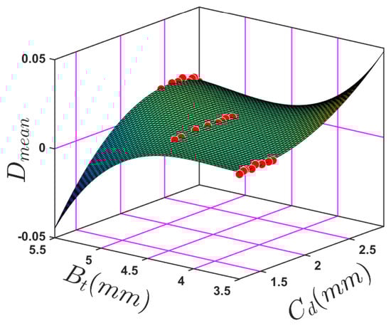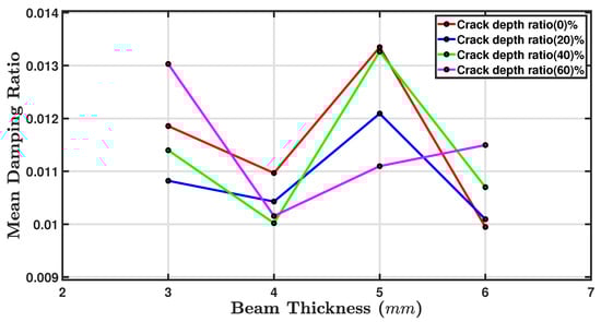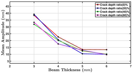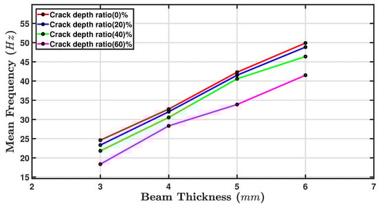 The fundamental frequencies of a beam can be significantly affected by the presence of a crack. The crack changes the local stiffness of the ABS beam, which in turn influences the vibration behaviour [66,67]. Of course, increasing the thickness of a beam directly increases its stiffness, which increases its natural frequencies. Figure 14 shows a line graph of the mean frequency (Hz) plotted against beam thickness in mm. The four lines represent different crack depth ratios (depth of crack/beam thickness), which are expressed as percentages: 0, 20, 40, and 60%. The beam thickness was from 3 mm to 6 mm in increments of one mm. The mean fundamental frequency ranged from approximately 18 Hz to 55 Hz. Figure 14 shows that as the beam thickness increased, the mean of the first or fundamental frequency [68] also increased for a given crack depth ratio. This trend was consistent across all thicknesses and crack depths, showing a linearly positive correlation between beam thickness and mean frequency: For a given beam thickness, as the crack for a given beam thickness and as the crack depth ratio increased, the mean frequency decreased [69], as shown. For instance, at a mm beam thickness, the mean frequency was approximately 24 Hz for zero crack depth, while for a ratio of 60%, it was around 18 Hz. The mean frequency for beams with no cracks (0% crack depth ratio) was consistently the highest for all thicknesses, and the greatest crack depth ratio (60%) always resulted in the lowest mean frequency.
