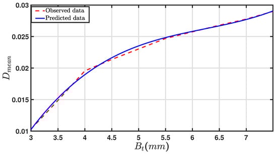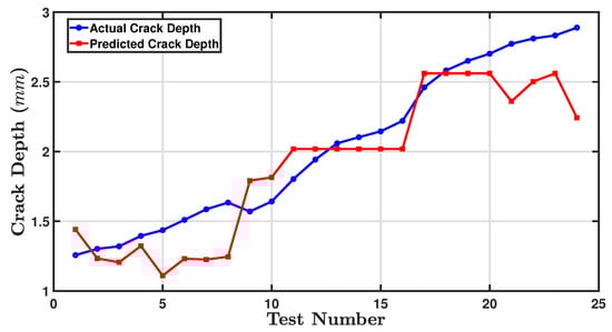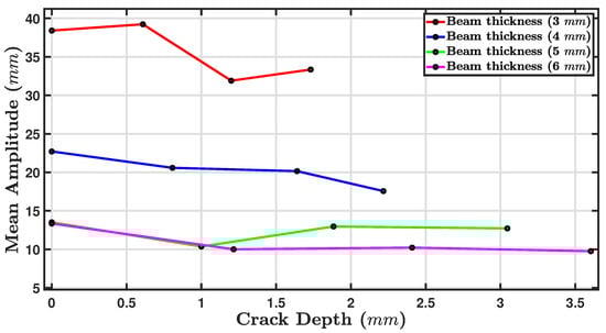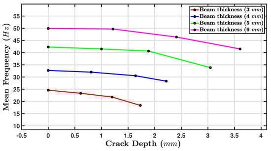 Experimental and analytical findings from various research papers confirm that as cracks developed in beams, the structure’s natural frequency decreased; as a crack developed, the natural frequency of the cracked beam reduced [57,70,71,72]. Figure 15 shows a line graph that illustrates the relationship between mean frequency (Hz) and crack depth (mm). The four lines on the graph each correspond to a different beam thickness: 3 mm (red), 4 mm (blue), 5 mm (green), and 6 mm (magenta). The crack depth ratio ranged from 0 mm to just over 4 mm. The mean frequency ranged from approximately 18 Hz to 49 Hz. It can be clearly seen that for all four beam thicknesses, as the crack depth increased, the mean frequency decreased due to the decrease in stiffness of the beam [73,74]. This inverse relationship indicates that the presence of a crack in the material of the beam decreases the beam’s fundamental frequency. The steeper the slope of the line, the more pronounced the effect. The mean fundamental frequency of the 3 mm thick intact beam (red line) was about 24 Hz, but for the same beam with a 1.7 mm deep crack, the mean fundamental frequency decreased to about 20 Hz. The intact beam of 6 mm thickness (magenta line) had a mean fundamental frequency of approximately 49 Hz. However, the introduction of a crack of the depth of 3.6 mm decreased it to around 41 Hz. However, the rate of decrease in the mean frequency as the crack depth increased was steeper for thicker beams. For instance, the 6 mm beam showed a more gradual decline in mean frequency compared to the 3 mm beam over the same crack depth range.
