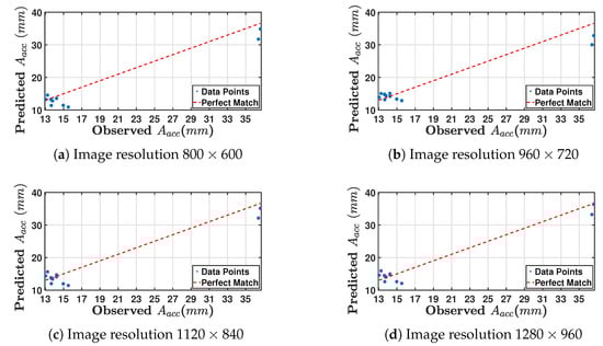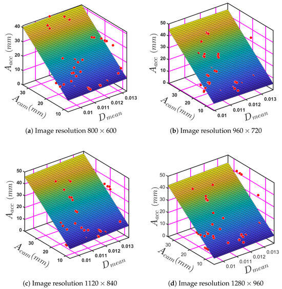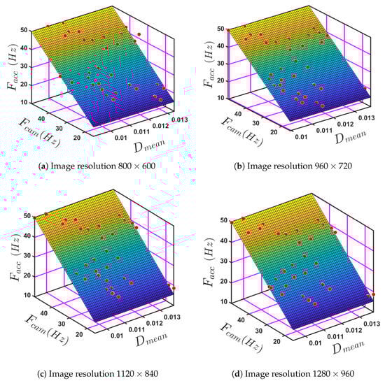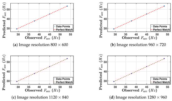 During the resonance testing phase, the camera’s frames per second (FPS) settings were adjusted to capture videos of the beam’s oscillations. The varying beam thicknesses present a challenge in selecting the FPS as constants to examine the dynamic response of beam structures, given their different natural frequencies. The approach was used to select the FPS based on the natural frequency of each beam thickness. The FPS values were selected within a range of , , , and , where the variable f represents the fundamental frequency. Here, it was determined using an accelerometer during the impact test. The camera resolutions were set to four constant values, , , , and pixels, since they represent commonly used cameras’ values. The complete experimental design was used to comprehensively evaluate the influence of the camera setups on the measured dynamic properties in presenting small cracks in damped structures. Table 3 shows the experimental scheme of the dynamic response tests, where is is several-fold of fundamental frequency.