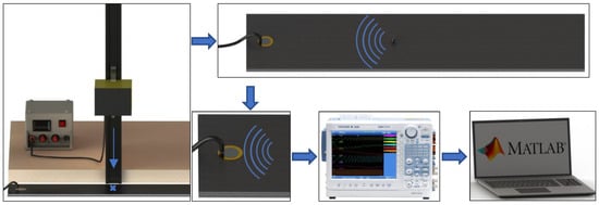 A workbench schematic diagram of the launching sphere method is presented in Figure 1. One notes that the sphere’s collision with the plate generates acoustic waves on the material. The signals are collected by the piezoelectric transducer, which is connected to an oscilloscope, and digitally processed on MATLAB® software (Natick, MA, USA).