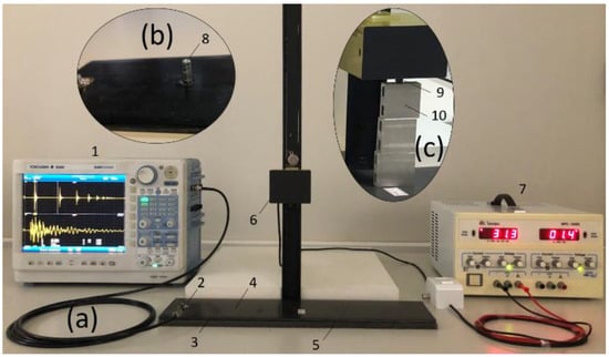 Test bench. In (a) oscilloscope (1), piezoelectric diaphragm (2), CFRP or aluminum plate (3), damage addition point (4), foam sheet (5), launching device (6), voltage source (7), metal nuts. In (b) (8), metallic sphere. In (c) (9), aluminum template or model (10).