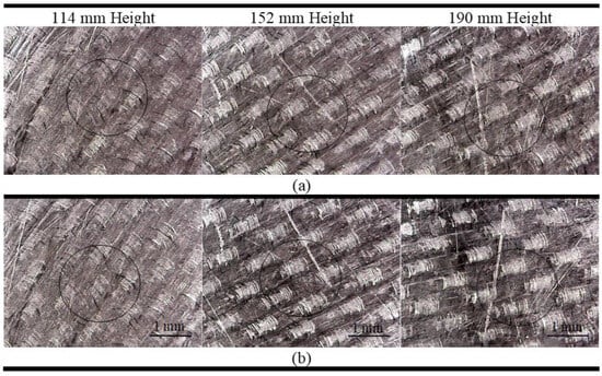 Figure 3 shows the microscopic images obtained for CFRP before (a) and after (b) the sphere impact for three launching heights. It can be observed in the circled areas where the impacts occurred that there is no apparent damage at the tested heights.