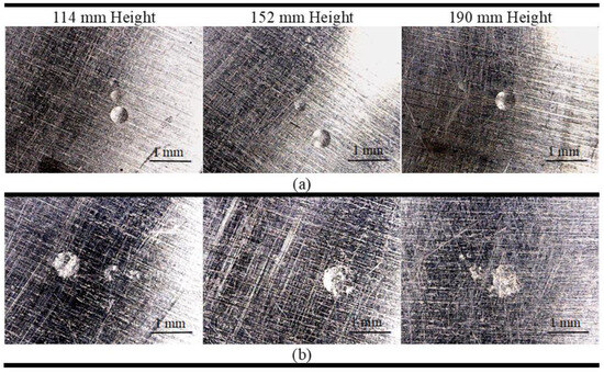 The microscopic images obtained for the aluminum are shown in Figure 4. In the images, the marks resulting from the sphere’s impact on the aluminum plate surface after the first launch are evident. The 3.9 mm sphere caused circular damage of about 0.5 mm diameter, while the 6.3 mm sphere caused similar damage of about 0.8 mm diameter. However, it is seen that the damage caused by the 3.9 mm sphere is deeper. The smaller marks around the impact area are due to the spheres rebounding off the plate surface.