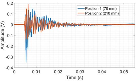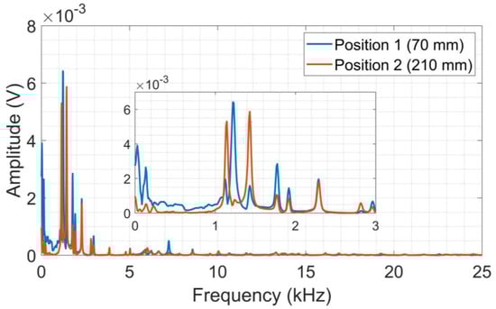 Figure 6 shows the average frequency spectra. The amplitudes vary based on the test location, alternating between the lead break positions along the spectrum. In certain ranges, the amplitudes are higher for position 1 (70 mm), as demonstrated by the amplification of the 0 to 3 kHz band in Figure 6. Spectral activity is observable up to about 25 kHz, especially in the range of 0 to 10 kHz, where amplitudes are higher. The results showed that the piezoelectric transducer and CFRP assembly are sensitive to the impact generated by the lead breaking on the plate surface. It is worth mentioning that CFRP is a heterogeneous and anisotropic material, with much lower density than metals, providing that the dispersive and dominant flexural out-of-plane Lamb waves easily travel on its surface. Furthermore, acoustic waves propagating in a fiber-reinforced composite are subject to scattering and attenuation, even though the whole system is perfectly elastic. This is due to the multiple dispersion of incident waves through the randomly distributed composite fibers [,].