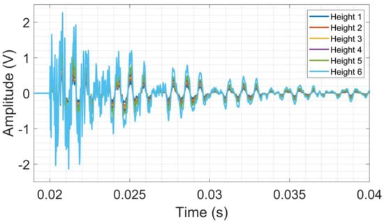 The time domain raw signals were segmented to extract only the first sphere touch on the CFRP surface. The analysis of the raw signal obtained from the sphere launch tests on CFRP reveals that the highest amplitudes presented are obtained from higher launch heights, as seen in Figure 8.