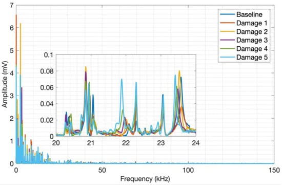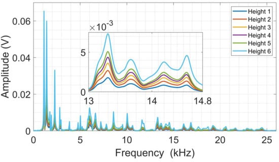 Figure 9 presents the frequency spectra from the raw acoustic signals acquired from the sphere launch tests performed on the CFRP structure. As can be seen, the signal amplitude varies with the launch height, as was observed in the raw signal. The frequency range between 13 kHz and 14.8 kHz, illustrated in Figure 9, shows in detail the amplitude variation caused by the launch height variation, i.e., the higher the launch height, the higher the amplitudes obtained. This behavior is almost repeated across the entire spectrum, where spectral activity is detected up to about 25 kHz.