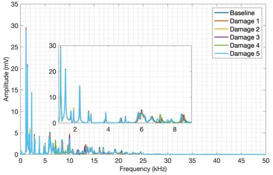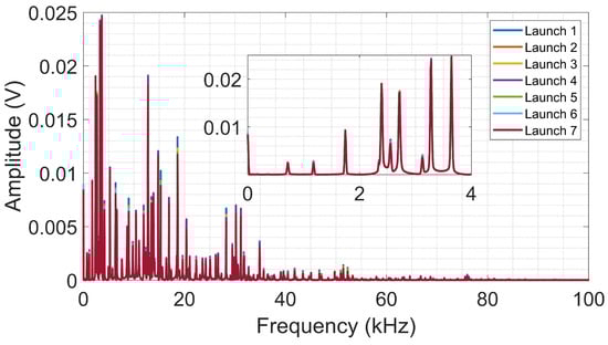 Figure 10 illustrates the frequency spectra obtained from the sphere launch tests on the aluminum surface. Similar to the PLB test, it is observed that the spectra show a wider frequency band and smaller amplitudes when compared to the amplitudes obtained from the CFRP. When analyzing a smaller frequency band (up to 4 kHz), it is possible to observe an almost complete overlap of the signals, indicating the high repeatability between the tests.