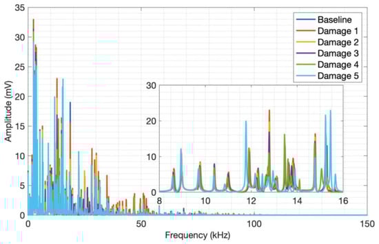 The spectra for each PLB test are shown in Figure 7. It is possible to notice wider frequency responses for aluminum when compared to CFRP but with lower amplitudes.