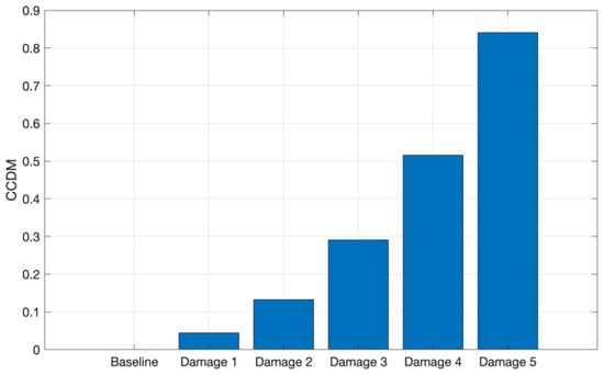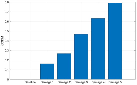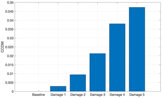 The CCDM was computed for aluminum, as shown in Figure 14, where a similar behavior to that reported for CFRP is observed. The progressive increase in the CCDM index indicates that the increasing structure mass leads to a shift in the frequency component of these signals, demonstrating that the used metric is sensitive to mass variation and, therefore, able to identify the simulated damage on the aluminum structure, as in the CFRP.