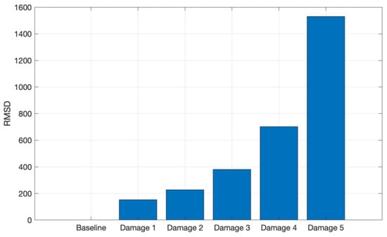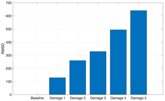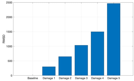 Similarly, the RMSD index for the aluminum test signals is shown in Figure 16, i.e., there is a gradual index increase as the masses are added to the structure.