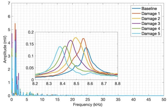 Previous studies on SHM have used statistical parameters to characterize damage, such as root mean square deviation (RMSD) and the correlation coefficient deviation (CCDM) []. Transducers are connected to a data acquisition (DAQ) system. This system collects mechanical sound waves that propagate through the structure and transfer them to a computer for digital processing. Regions of interest can be selected in the time domain, and frequency bands can be filtered using frequency spectrum analysis. To search for variations in the frequency content that are correlated to the structural conditions, the RMSD and CCDM damage indices can be calculated using Equation (1) and Equation (2), respectively [].