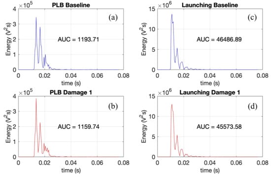 To show the significant difference between the signal energy between both PLB and launch tests, the signal energy from the launch tests as well as from the PLB tests were computed, considering a sliding window of 0.5 milliseconds and the signal average of the repetitions for each condition. Figure 19 shows the signal energy for baseline and damage 1 for PLB and launch tests, as the other conditions show similar results. It can be initially observed that the signal energy of the PLB tests is significantly smaller than that of the signal energy of the launch tests for both conditions. The area under the curve (AUC) of each condition was computed and is shown in the figure. To better illustrate these figures quantitatively, the energy ratio between the launch and PLB tests was computed for both conditions, which is equal to 38.98 for baseline and 39.30 for damage 1, demonstrating a significantly greater signal energy from the launch tests.