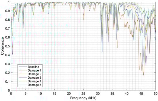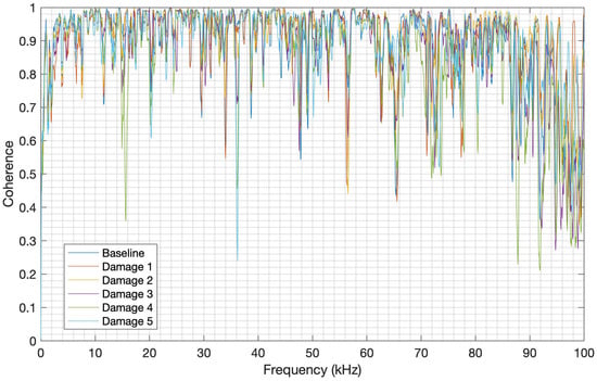To measure how well the signals from the launch tests correspond to the signals from the PLB tests at each frequency, the magnitude-squared coherence (MSC) was computed, as applied in the work of []. The MSC of each repetition was computed for each structure condition and material, and then an average was obtained. The function named coherence available in MATLAB was employed with a hamming window of 218 lengths and an overlap of 50%. Figure 22 and Figure 23 show the MSC between the launch and PLB tests for CFRP and aluminum, respectively.