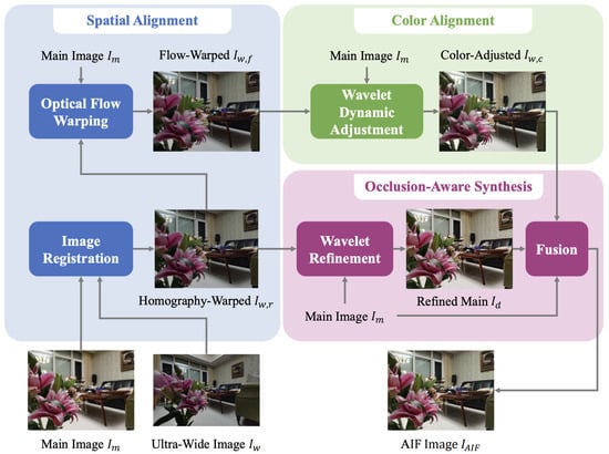 Due to the fixed aperture of smartphone cameras, research has been conducted into synthesising an evenly focused image (i.e., without a depth of field effect) via fusing images with differing focal lengths. Luo et al. [6] achieved focus synthesis via fusing an image from ultra-wide and wide-angle input images (see Figure 2). Significant challenges are present in aligning asymmetrical images under different parameters and ISP pipelines. To align images, a homography and flow-warping process was applied, as a single homography warping was impossible due to larger background disparities in comparison to the foreground. Hence, key points were extracted and processed to compute initial correspondences between the images, then pruned using a neural network. The ultra-wide-angle image was then warped to provide an approximately aligned image. To refine the alignment, a flow map was estimated and aligned. A series of wavelet transformations and CNNs align the ultra-wide colour profile to that of the reference wide-angle image. Finally, the images were fused using a CNN. Their overall alignment process could fail under certain conditions, showing warping artefacts; however, this appeared to have little impact on the qualitative and quantitative data they produced, likely due to their fusion CNN.