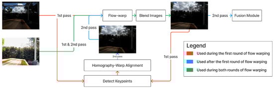 Mishkin et al.’s Affnet model [17] was used to detect affine shape and keypoint pairs. The model’s strength in matching local affine-covariant features was a deciding factor. Additionally, Affnet demonstrated excellent performance matching features between image pairs with wide exposure differences. Keypoints were filtered via random sample consensus (RANSAC) and used to calculate a homography matrix, through which the ultra-wide images were warped (see Figure 4) [18].
