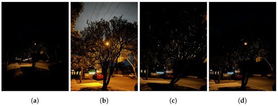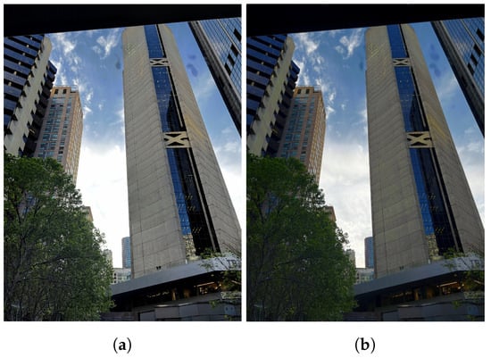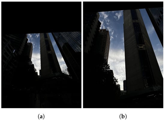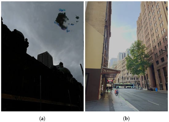 Due to the novelty inherent in ASHDRI, no existing dataset is capable of sufficiently assessing the performance of the proposed method. As such, images were captured using two phones in distinct scenes with differing lighting conditions and obstacles that could cause difficulty for HDR generation. This included harsh lighting that occluded scenery from one or both views and scenery that existed in only one viewpoint. Images were captured on an iPhone 13 Pro and a Samsung Galaxy S21+. On the iPhone, images were captured using Ashutosh Billa’s ProCamera—Capture RAW photos application [22], as it automatically captured image triplets with exposure values of −2, 0 and 2 EV. This ensured that the proposed method could be compared against existing methods fairly by generating HDR images from the ultra-wide/wide image pair at distinct EVs, and from a wide/wide or ultra-wide/ultra-wide image pair. Results were processed on a Windows 10 computer with 32 GB of DDR4 RAM, an AMD Ryzen 3600X CPU and an NVidia RTX 3070 GPU (sourced in Sydney, Australia).