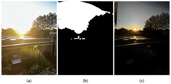 Exposure thresholding process. (a) Wide-angle input. (b) Exposure mask. (c) Post-thresholding image.