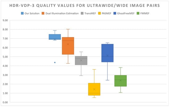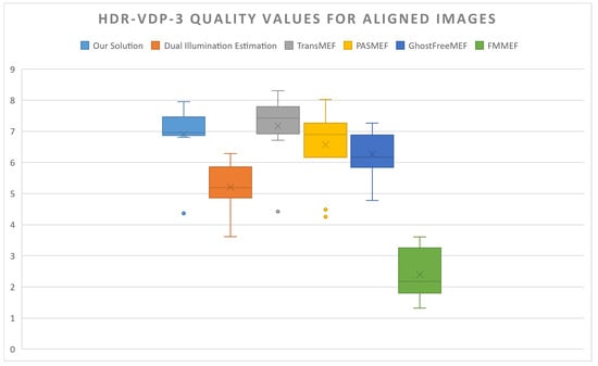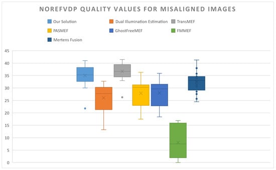The NoRefVDP results (see Figure 17) indicate that the ASHDRI pipeline performs well on misaligned images relative to other solutions; however, this again differs from the qualitative evaluation of the results. NoRefVDP is designed to detect quality results considering already known forms of image degradation. As results were processed with a pre-trained NoRefVDP model, it is unlikely to have been trained on the unique forms of noise and blending artefacts present in the proposed asymmetric HDR use-case and might not be trained to register blurring. This can be seen by the high Q scores for the TransMEF module, despite exhibiting high blurring (see Figure 13h).