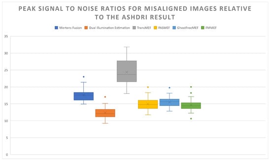 SSIM scores indicate that the majority of the competing solutions are only able to recreate an image that is 70% similar to the ASHDRI result. However, the high performance of TransMEF and poor performance of Dual Illumination Estimation demonstrate the weaknesses of this model without a ground truth. As Dual Illumination Estimation reconstructs an HDR image from the medium-exposed input, the output possesses an inherently different structure leading to poor SSIM scores despite the strong subjective performance of the model. The high scores of TransMEF in this context, despite poor subjective results (see Figure 13h), highlight the biases of SSIM due to the reference image (the ASHDRI result) using the same fusion method. As such, the model considers the colour profiles and flaws of the TransMEF model (such as the poor contrast in the plants seen in Figure 14d,g) as the truth of the underlying scene, despite this not being the case. This similarly explains the PSNR scores seen in Figure 15.